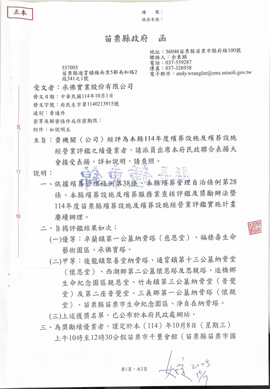 承佛寶塔 榮獲114年殯葬設施評鑑優等