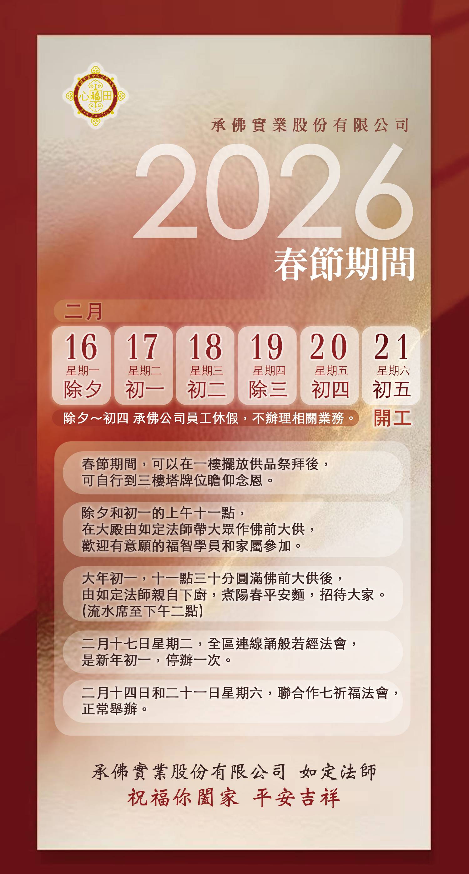 1、2026年2月16,17,18,19,20日,春節,除夕~初四期間,承佛公司員工休假,不辦理相關業務。